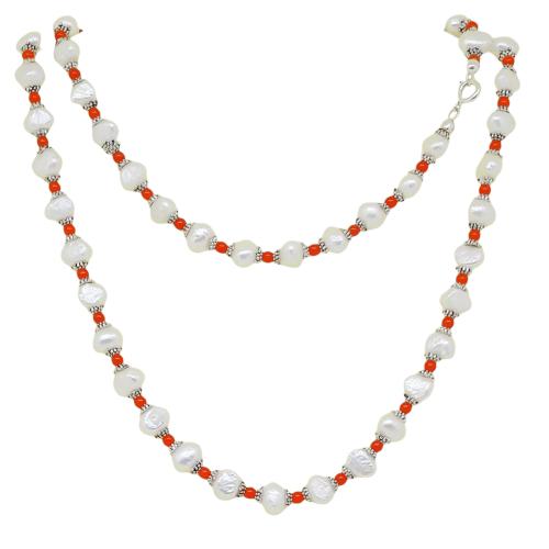 Spectacular long white pearls necklace decorated with red coral balls and zamak silvered details.