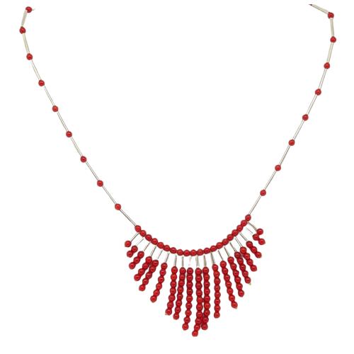 El Coral Collar Coral Rojo Bolitas y Barritas Plateadas forma triangular
