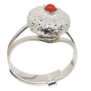 Anello in Corallo Rosso con Pallino centrale del diametro di 3mm. Montatura in Argento e misura Regolabile. Disegno a Forma di Riccio di Mare, un ricordo del mare da tenere con se' durante tutto l'anno.