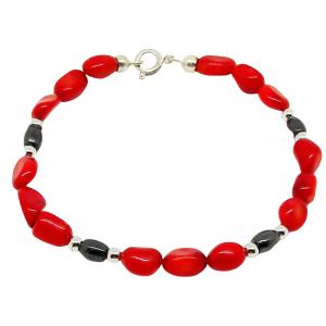 El Coral Bracciale Corallo Rosso Sassi Barocco e Ematite Olivette con Pallini e Chiusura Argentati, modello casual per un abbigliamento informale.